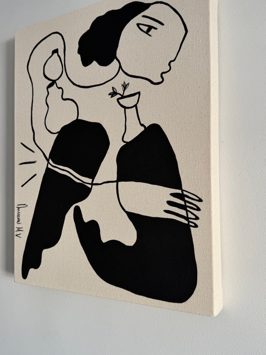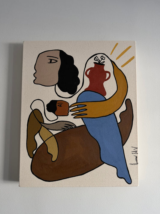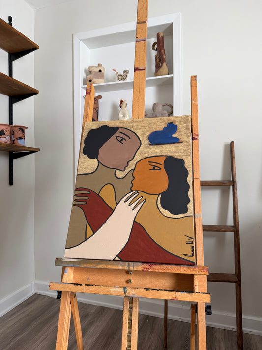 My work explores human connection, identity, and care through bold,abstracted forms and warm, earthy palettes. Each piece reflects a story of tenderness and strength, rooted in cultural memory and personal narrative.